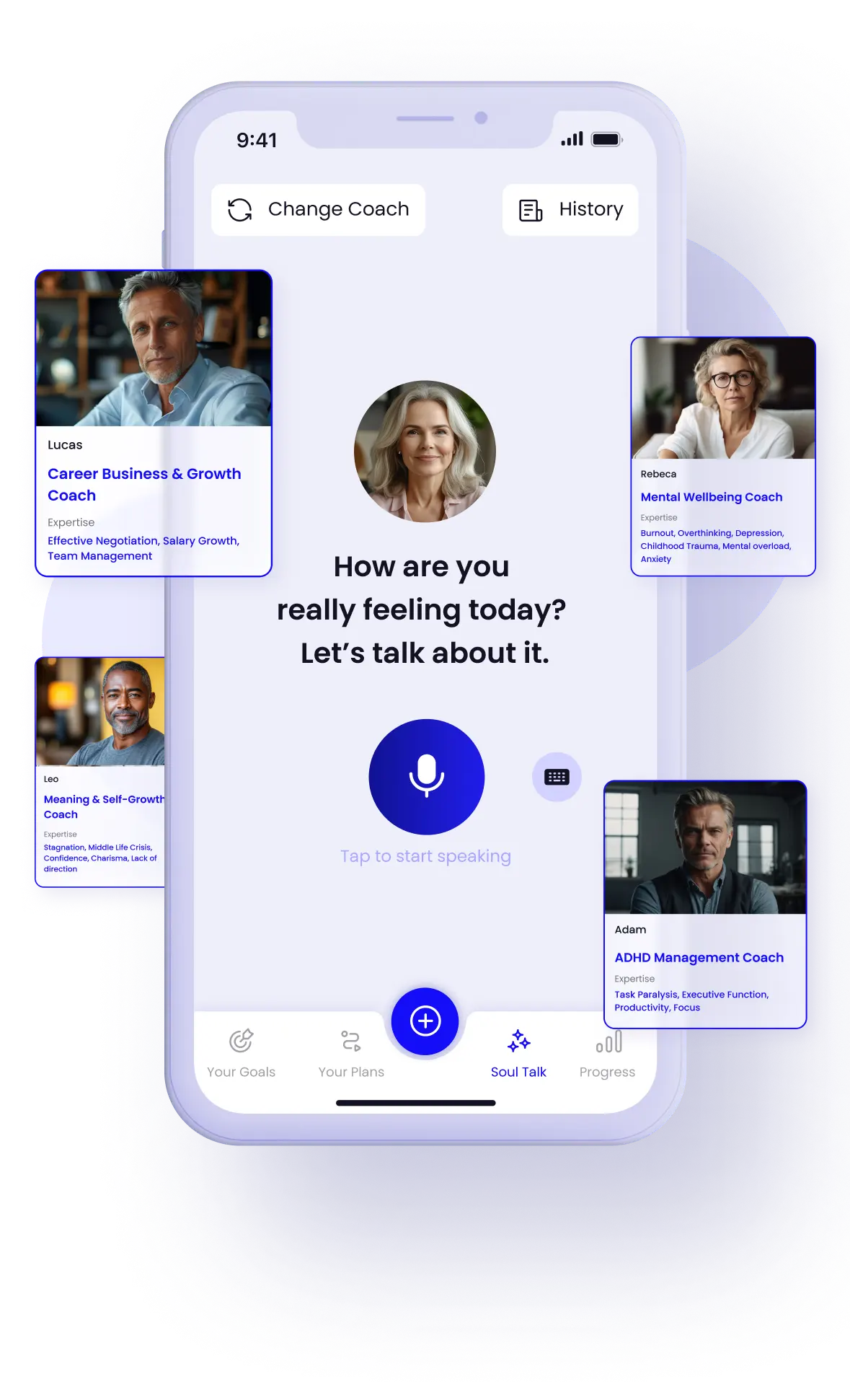Your pocket-sized coach that actually gets you.Talk to your AI Coach anytime for instant support, tailored advice, and gentle accountability.Choose your coach based on your needs — productivity, confidence, focus, or emotional balance.