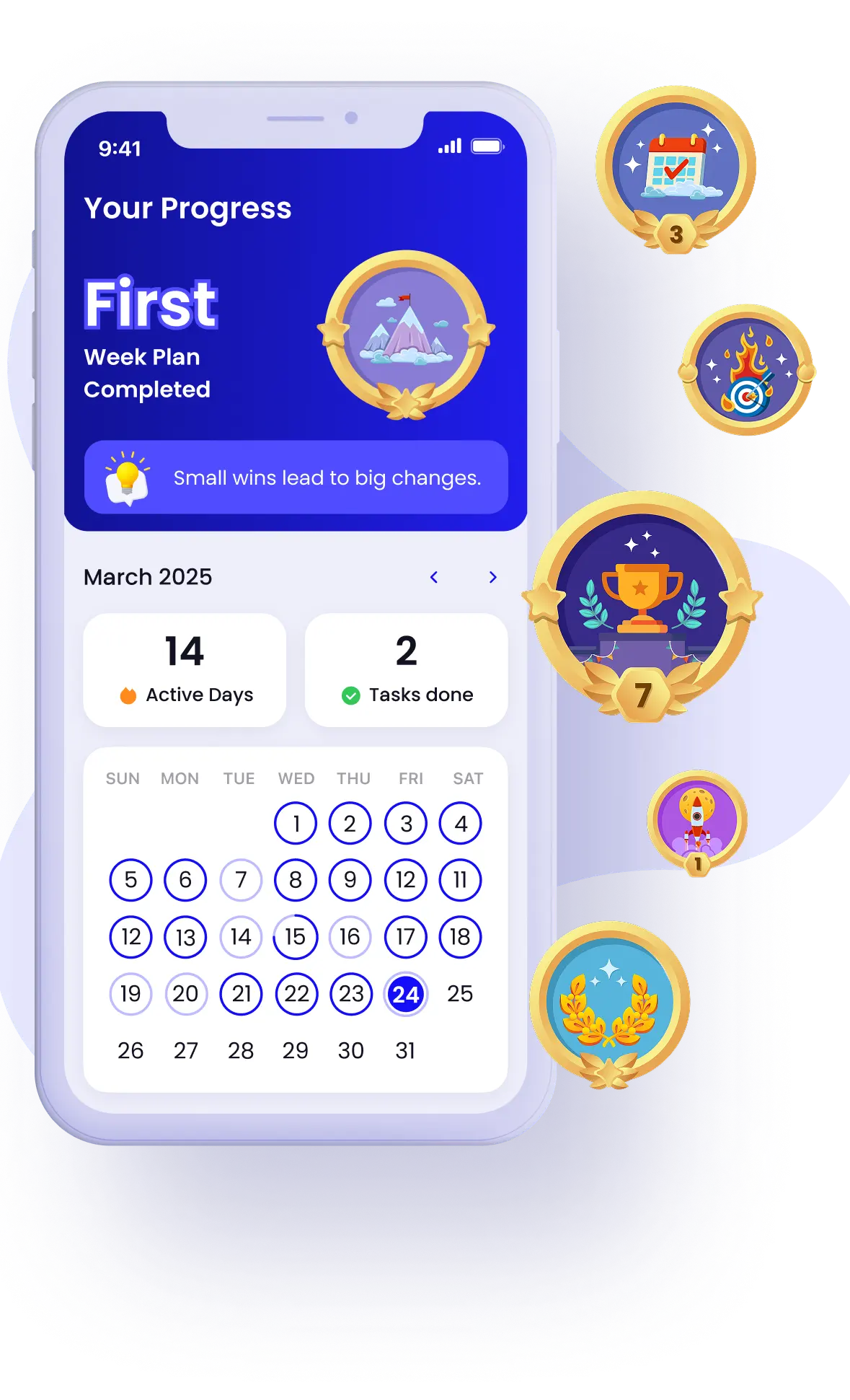 See your growth in motion. Your progress calendar and achievement badges show how far you’ve come — turning consistency into motivation. Every completed task brings visible proof that your efforts are paying off.